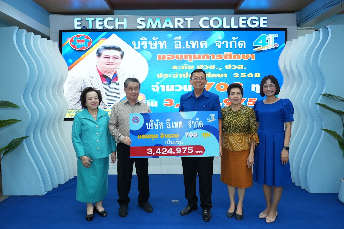 วันที่ 4 ธันวาคม 2568 คุณทิฆัมพร อรุณงามวงศ์ ประธานกรรมการ บริษัท อี.เทค จำกัด มอบทุนการศึกษาให้กับนักศึกษาระดับ ปวช. และ ปวส. ประจำภาคเรียนที่2 ปีการศึกษา 2568 จำนวน 629 ทุน รวมเป็นเงิน 3,308,623 บาท