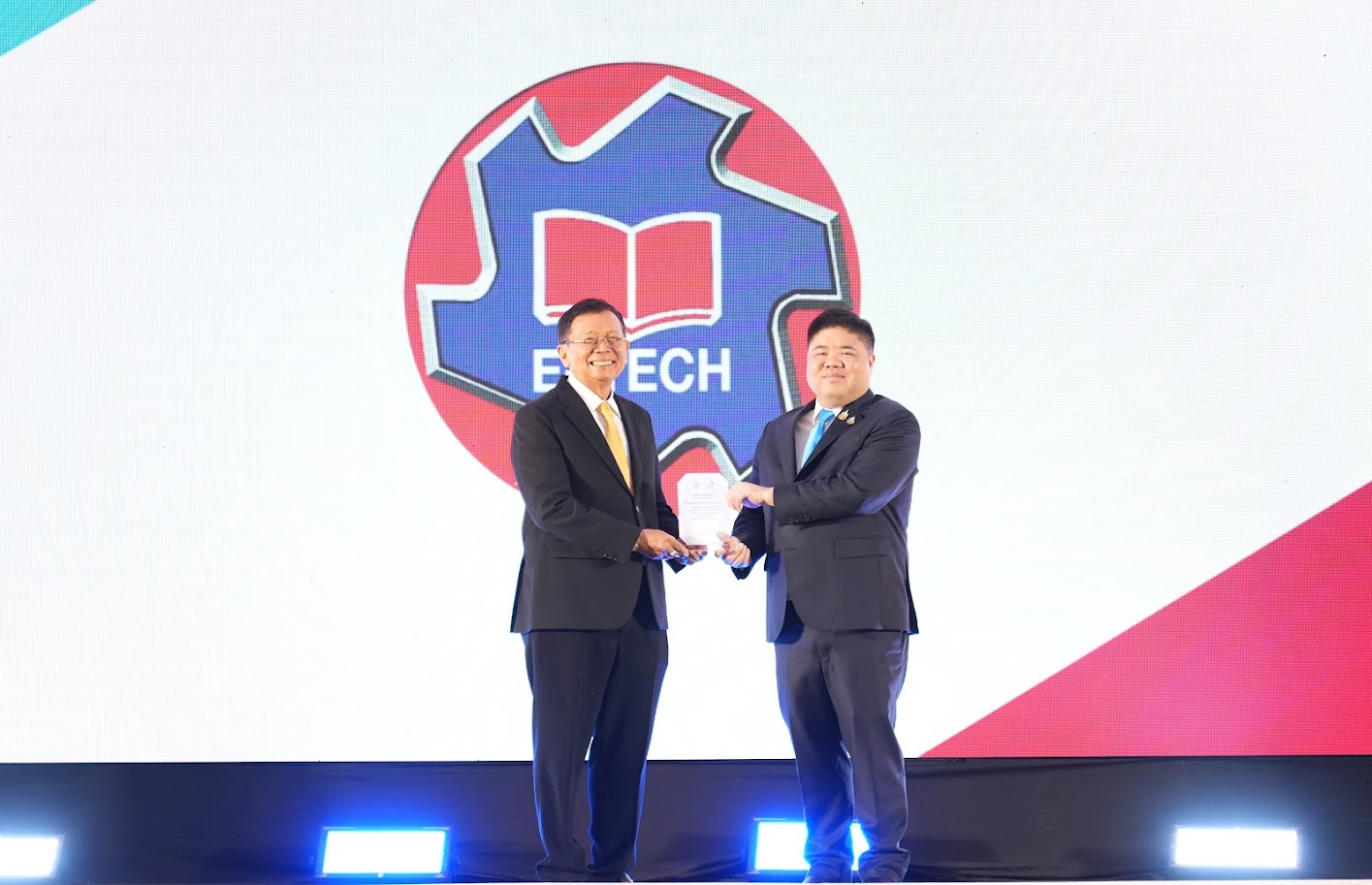 วันที่ 3 ธันวาคม 2568 นักศึกษา อี.เทค ได้รับโล่รางวัลจากนายกรัฐมนตรี นายอนุทิน ชาญวีรกุล จากการเข้าประกวดนวัตกรรมสร้างเสริมสุขภาพ Prime Minister’s Award for Health Promotion Innovation 2025 ประเภทอาชีวศึกษา (ปวช. หรือเทียบเท่า) จาก 35 ทีม ทั่วประเทศ คัดเลือกเพื่อเข้ารอบที่ 2 จำนวน 15 ทีม และรอบที่3 โดย อี.เทค เข้ารอบ10 ทีมสุดท้ายจำนวน 6ทีม ในการสร้างบอร์ดเกมเดดไลน์ แดช โปรเจกต์เด็กฝึก เพื่อสร้างประสบการณ์ให้ นศ. ที่ใกล้เรียนจบ มีภูมิคุ้มกันก่อนออกไปเผชิญความเครียดจากการทำงานในอนาคต โดยให้นักศึกษ