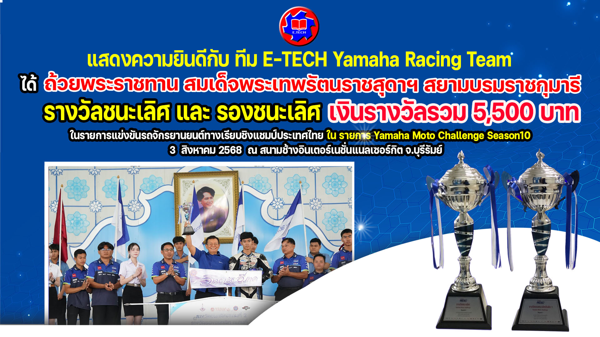 3 สิงหาคม 2568 ยินดี กับ ทีม E-TECH Yamaha Racing Team ได้ ถ้วยพระราชทาน สมเด็จพระเทพรัตนราชสุดาฯ สยามบรมราชกุมารี ได้รับรางวัลชนะเลิศ และ รองชนะเลิศ