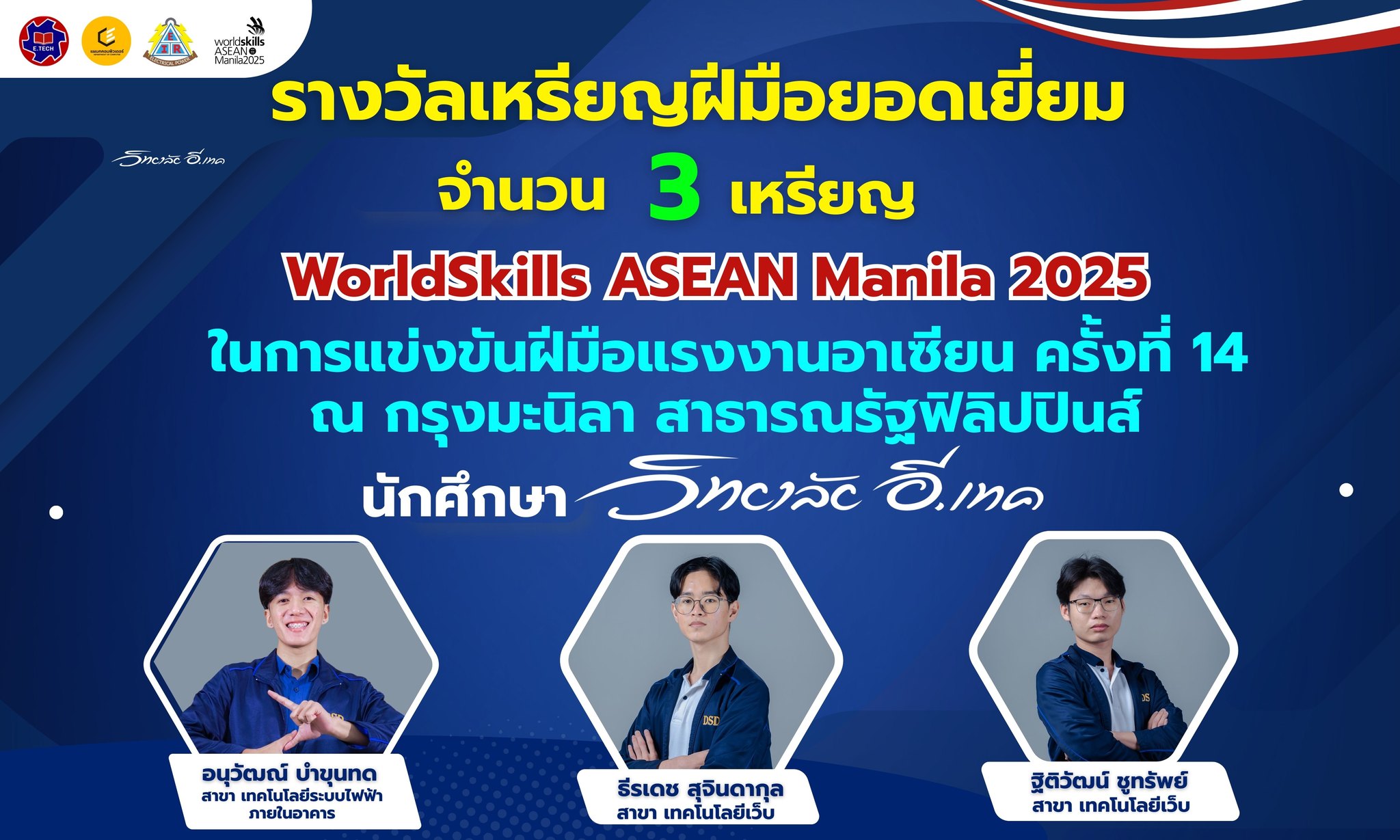 21-31 สิงหาคม 2568 ยินดีกับ นักศึกษา อี.เทค คว้ารางวัลเหรียญฝีมือยอดเยี่ยม จำนวน 3 เหรียญ World Skills Asean Manila 2025