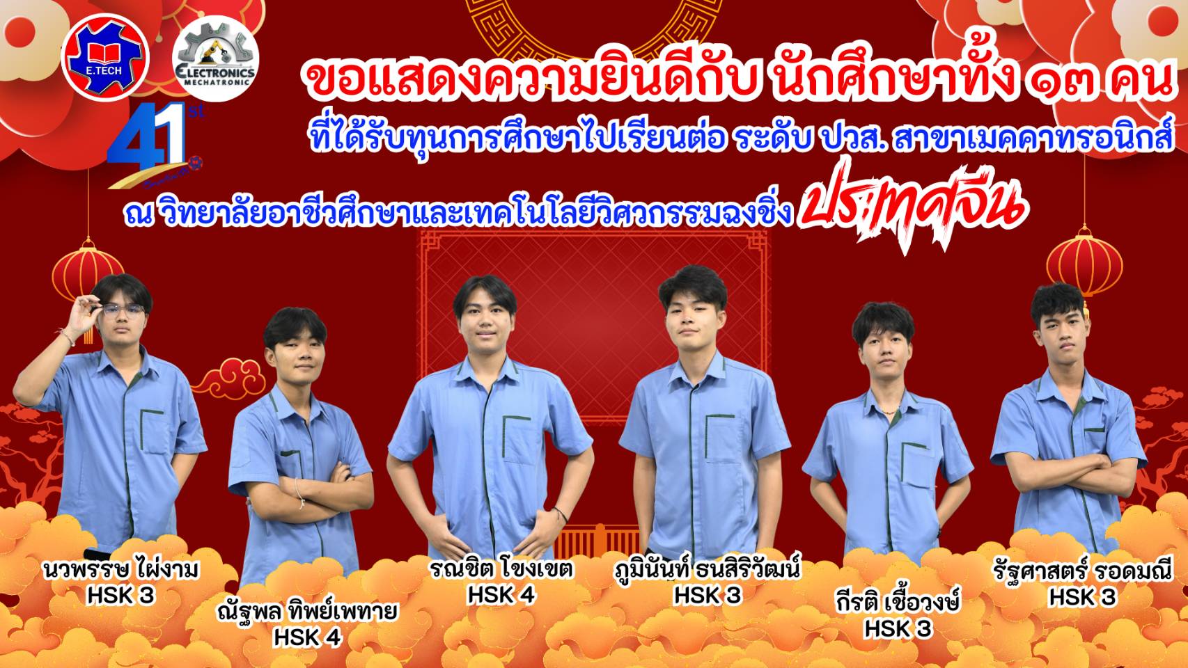 ที่ได้รับทุนการศึกษาไปเรียนต่อ ระดับ ปวส.สาขาเมคคาทรอนิกส์ ณ วิทยาลัยอาชีวศึกษาและเทคโนโลยีวิศวกรรมฉงชิ่ง ประเทศจีน