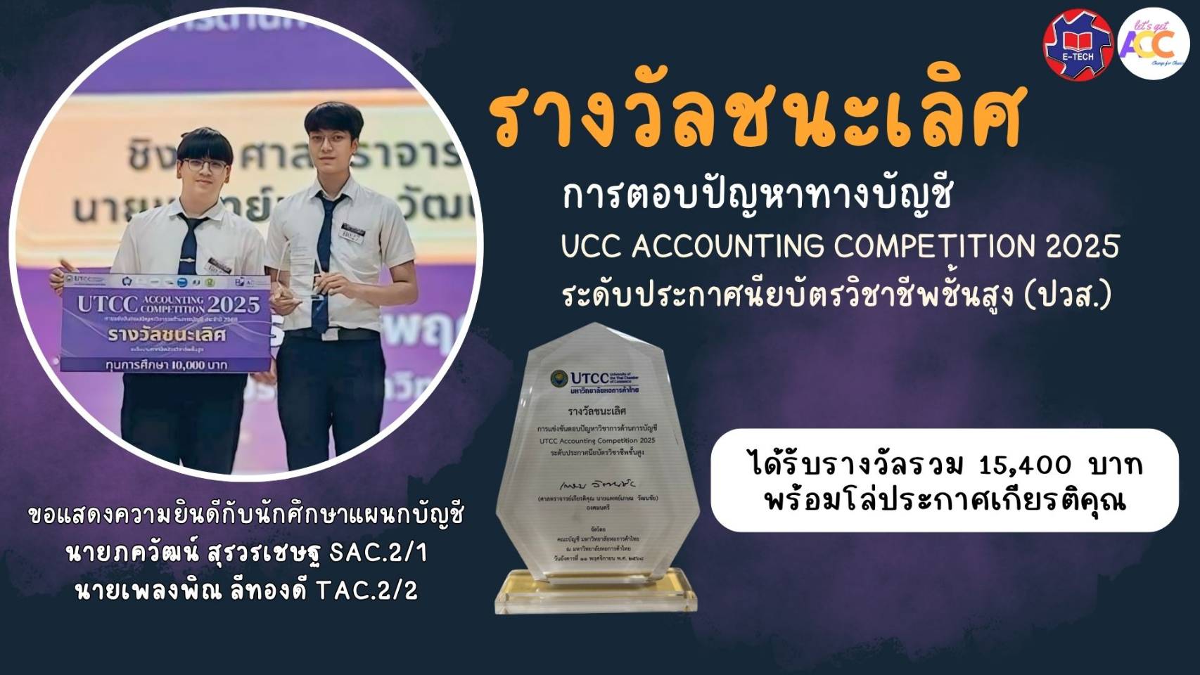 ขอแสดงความยินดีกับนักศึกษาวิทยาลัย อี.เทค แผนกการบัญชี คว้ารางวัลชนะเลิศ ในระดับปวช. และรองชนะเลิศอันดับ 2 ในระดับ ปวส. ในการแข่งขันตอบปัญหาวิชาการด้านการบัญชี ณ. มหาวิทยาลัยหอการค้าไทย