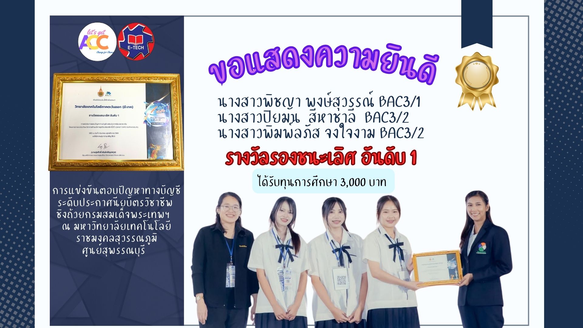 #บัญชีอีเทค คว้ารางวัลชนะเลิศ การแข่งขันตอบปัญหาการบัญชี ชิงถ้วย พระราชทาน สมเด็จพระกนิษฐาธิราชเจ้า กรมสมเด็จพระเทพรัตนราชสุดาฯ สยามบรมราชกุมารี ณ มหาวิทยาลัยเทคโนโลยีราชมงคลสุวรรณภูมิ