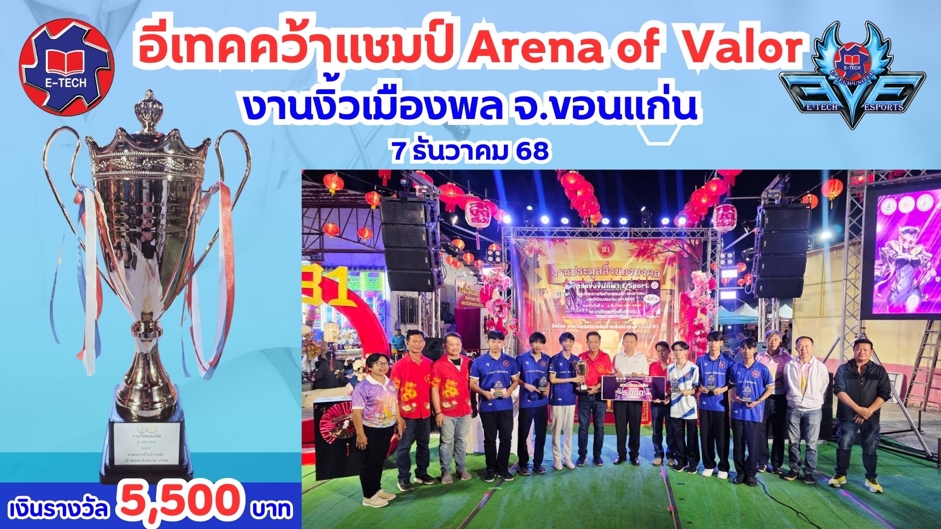 วันที่ 7 ธันวาคม 2568 ขอแสดงความยินดี กับ นักศึกษา วิทยาลัย อี.เทค คว้ารางวัลแชมป์ Arena of Valor